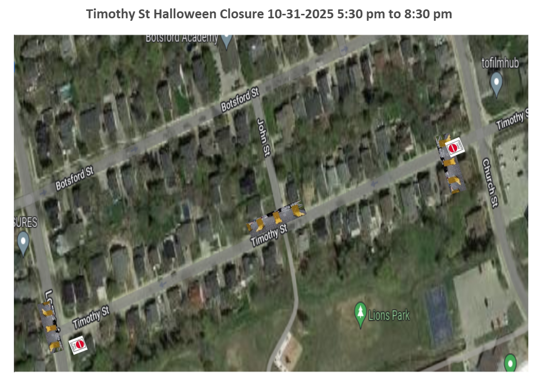 Timothy Street and John Street from Church Street to Lorne Avenue will be closed on Friday, October 31 from 5:30 to 8:30 p.m. for Halloween trick-or-treating.